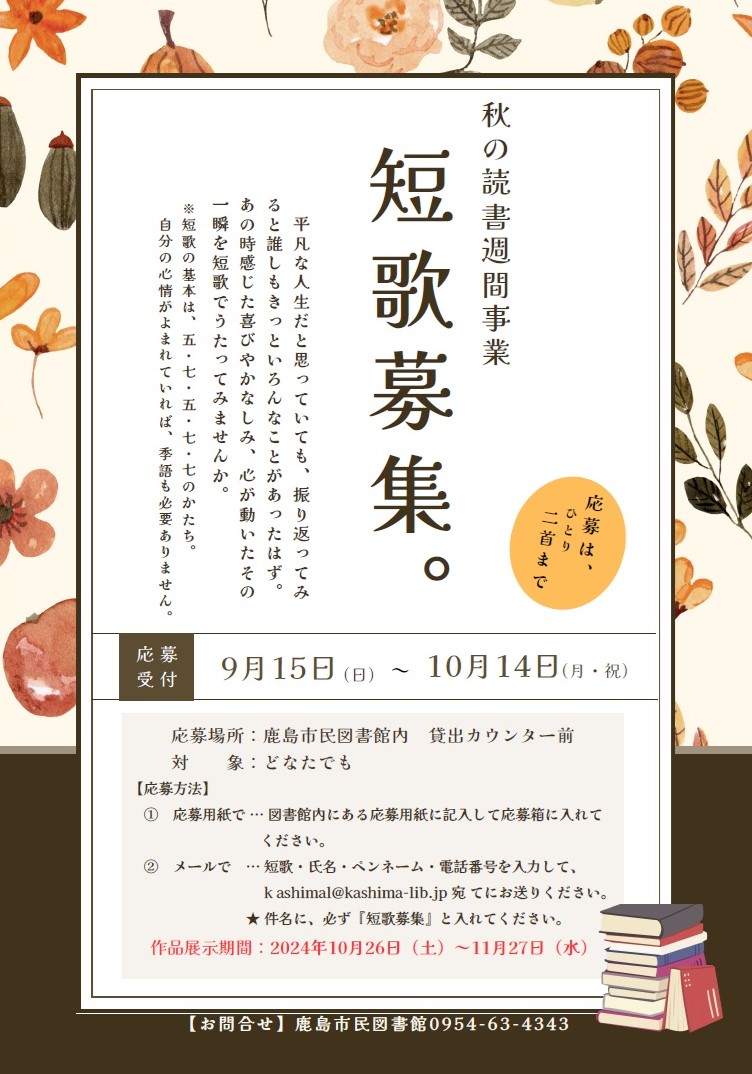 秋の読書週間事業『短歌募集。』に、たくさんのご応募ありがとうございました。